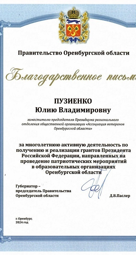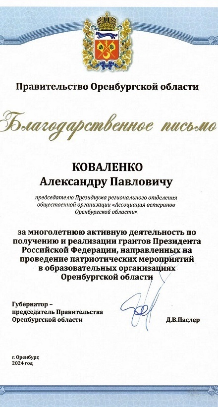 Благодарственным письмом Губернатора Оренбургской области Дениса Паслера за многолетнюю работу по развитию ветеранского движения, большой вклад в патриотическое воспитание подрастающего поколения и активную профессиональную деятельность по формированию духовно-нравственного потенциала студентов и школьников награждён Председатель Оренбургского РОО «Ассоциация ветеранов Оренбургской области», руководитель Президентского гранта 2023 года «Ветераны всегда в строю!», а также 2024 года «Плечом к плечу - в едином строю!» полковник Коваленко Александр Павлович его заместитель по военно-патриотической работе с молодежью, кандидат педагогических наук Пузиенко Юлия Владимировна.